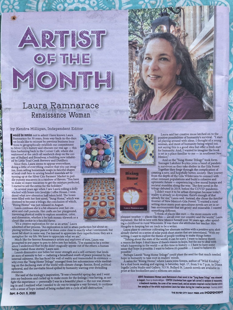 Laura Ramnarace’s book, “Growing Home,” the second in a trilogy, is the best book I’ve read this year. It bursts at the seams with uncanny insight into the aftermath of a global pandemic and the potentially devastating consequences of ravaging Mother Earth while stripping her vitality. The characters dove straight into my heart, dealing with very real, pertinent issues. Laura highlights difficulties that would be faced after a collapse of society: rebuilding communities with governments, discovering the qualities of truly capable leaders, finding the balance between staying safe and reaching out to trust others, all while begging the questions of what skills are really valued; what possessions truly precious? When asked how she had the intuition to write a book about a virus right before there was literally a global pandemic ravaging our world, Laura pointed to melting ice caps and thawing permafrost, along with the very real possibility of those ice caps containing viruses which humans would not be immune to. In facing this reality, Laura expressed that she “desperately needed a story about how we could survive” so she wrote “Growing Home” as an antidote; “a reality where we could pull this off and humanity had a second chance.” This is a post-apocalyptic but not dystopian or utopian tale with so many nods to Silver City, WNMU, and Southwest NM that I could feel the local bonds in my bones. Universality and connection, those things which make us human no matter our race, heritage or life experiences, are bountiful in this absolutely beautifully scribed tale. This is the kind of book that made me late for meetings in the morning because I couldn’t put it down at night; the kind of book that I woke up thinking about; that made me cry and laugh.